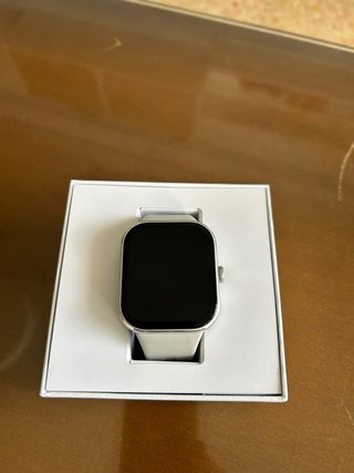 Reloj inteligente con un diseño moderno y elegante. - Correa de color blanco. - Bisel plateado.