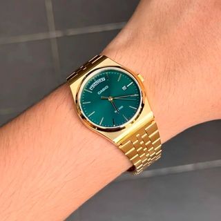 Elegante reloj Casio con una esfera verde vibrante y detalles dorados. - Diseño clásico con brazalete. - Resistente al agua 50 metros. - Indicador de día de la semana.