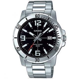 Elegante reloj de pulsera Casio con una esfera negra y detalles plateados. - Diseño clásico y versátil. - Correa de acero inoxidable. - Resistente al agua 50M.