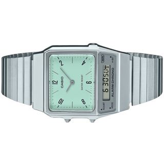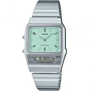 Reloj Casio con un diseño retro y esfera en tono verde menta. La correa es de acero inoxidable plateado. - Esfera analógica y digital. - Resistente al agua (Water Resist). - Correa de eslabones de acero.
