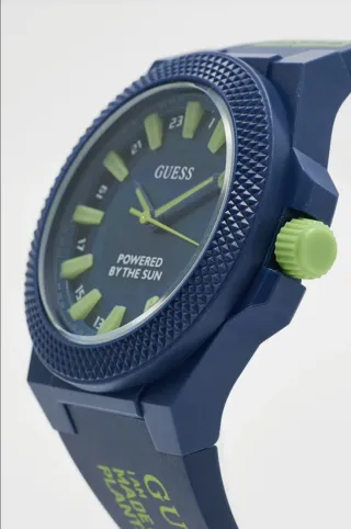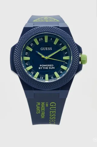 Reloj Guess con un diseño moderno y llamativo. NUEVO A ESTRENAR Y ORIGINAL 100% -Unisex - Correa de material sintético en tono azul. - Detalles en verde brillante en la esfera y la corona. - Esfera azul con marcadores horarios y manecillas en contraste. -Sumergible max 30metros. - Inscripción POWERED BY THE SUN en la esfera. - Inscripción GUESS ECO I AM MADE FROM PLANTS en la correa.