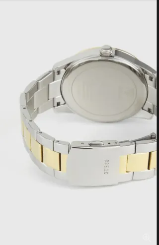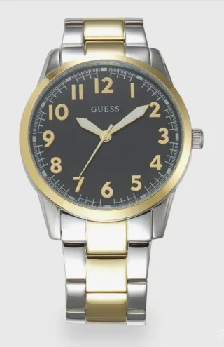 Elegante reloj de la marca Guess con un diseño bicolor que combina tonos dorados y plateados. Su esfera oscura resalta los detalles. NUEVO A ESTRENAR Y ORIGINAL 100©% - Bisel con acabado dorado. - Correa de eslabones combinada en dorado y plateado. - Números y manecillas en tono dorado.