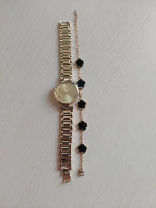 Conjunto de reloj y pulsera. - Material: Acero inoxidable. - Diseño de eslabones en el reloj. - Pulsera con colgantes de trébol negro.