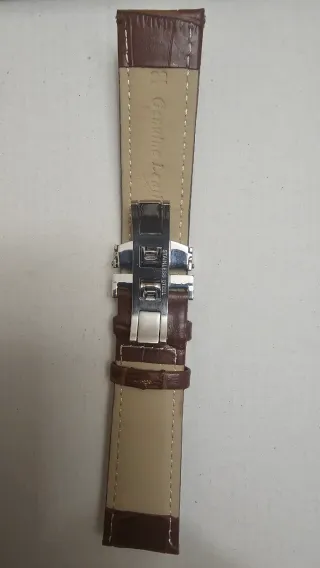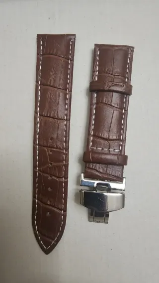 Correa para reloj en piel con acabado de cocodrilo y pespuntes blancos. Incluye un cierre de mariposa. Nueva a estrenar, nunca usada, aunque presenta unas manchas en un extremo interior. - Material: Piel - Ancho: 22mm - Cierre: Mariposa