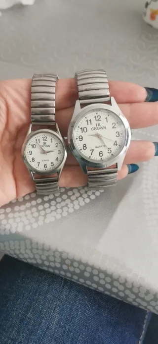 Par de relojes unisex con correa extensible. - Esfera blanca. - Correa metálica plateada. - Cierre de lengüeta.