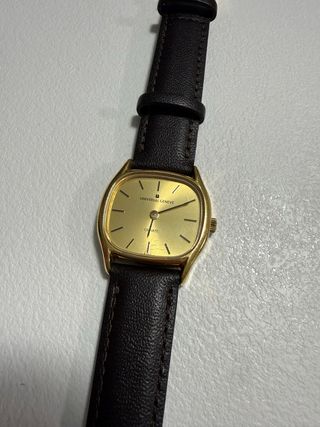 Reloj Universal Genève Vintage para mujer (años 80) Elegante reloj vintage de la prestigiosa marca Universal Genève, fabricado entre 1980 y 1989. Movimiento de cuarzo, con caja de acero inoxidable chapada en oro y esfera color dorado. Diámetro de la caja de 25 mm, perfecto para muñecas finas. Correa de piel (longitud muy corta, menos de 160 mm). Se encuentra en buen estado, con signos visibles de uso propios de su antigüedad. No incluye caja ni documentación original. Una pieza clásica y sofisticada, ideal para amantes de los relojes vintage.