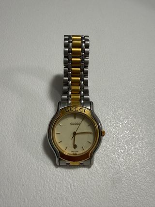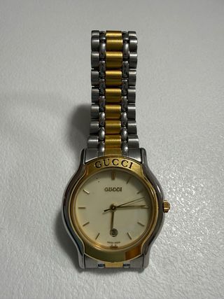 Reloj Gucci vintage para mujer – Modelo 8000L Reloj original Gucci para mujer, de estilo vintage clásico, equipado con movimiento de cuarzo suizo. Caja y brazalete de acero inoxidable con detalles chapados en oro, que aportan un elegante diseño bicolor atemporal. Esfera en tono champán/ivory, con agujas doradas y ventana de fecha a las 6. Diámetro de la caja de aproximadamente 29 mm (sin corona) y circunferencia de cierre de unos 15 cm. Estado vintage, con arañazos, desgaste y ligera decoloración en las partes chapadas en oro, propios del uso y la edad. Falta uno de los marcadores horarios del dial, visible en las fotografías.