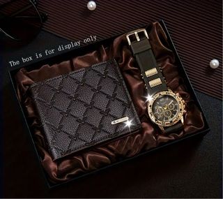 Elegante pack de regalo para hombre que incluye una cartera y un reloj. - Cartera con diseño acolchado. - Reloj con detalles dorados y correa negra.