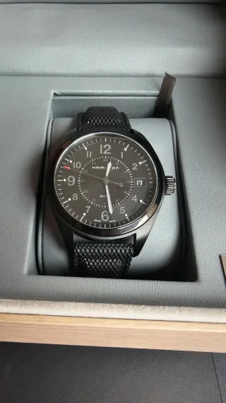 Reloj Hamilton Khaki Field con movimiento de cuarzo y caja de 40mm. - Esfera negra. - Correa de tela negra. - Ventana de fecha. *Precio en tienda oficial 645€
