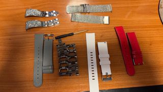 Conjunto de correas para reloj de 20 mm. Se vende todo el conjunto por cambio de modelo de reloj. - Correa de cuero gris. - Correa de cuero roja. - Correa de malla plateada. - Correa de metal plateada con detalles. - Correas de silicona blancas.