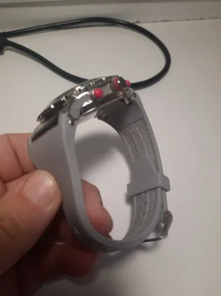 Reloj de pulsera para hombre con un diseño moderno y deportivo, como nuevo. - Correa de caucho texturizado. - Bisel plateado con marcadores de hora.