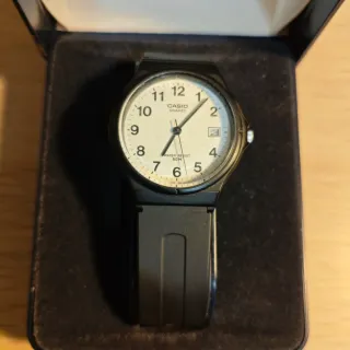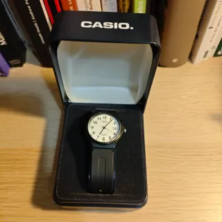 Casio original modelo MW-59 en color negro, un clásico conocido por ser súper resistente y ligero. El reloj está en buenas condiciones y funcionando perfectamente. Es un modelo muy práctico y legible, con esfera blanca, números grandes en negro y ventana de calendario a las 3. La correa de resina negra es la original de Casio y está bien conservada. En la parte trasera se puede ver que es resistente al agua hasta 50 metros (5 Bar), lo que lo hace ideal para el día a día sin preocupaciones. Se entrega con caja original de Casio. Un reloj básico pero eterno que nunca falla.