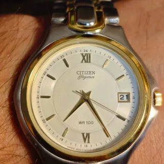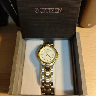 Reloj Citizen Elegance original y funcionando. Una pieza que combina a la perfección la elegancia del acabado dorado con la sobriedad del acero. El reloj se encuentra en excelentes condiciones estéticas y funciona perfectamente, manteniendo la precisión característica de la marca japonesa. Presenta un diseño minimalista con una esfera limpia, índices dorados y una ventana de calendario muy discreta a las tres. El brazalete de eslabones bitono es muy cómodo y el cierre es firme (va algo duro). Se entrega con un estuche original de Citizen; aunque es oficial de la marca, no puedo asegurar que sea el que traía este modelo.