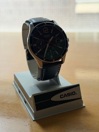 Elegante reloj Casio con diseño cronógrafo. - Esfera en tono oscuro. - Correa de piel negra con pespuntes blancos. - Detalles plateados en la caja y la esfera.