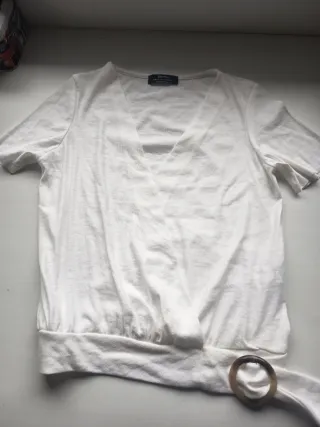 Camiseta de manga corta con escote en V y detalle de cinturón. - Tejido ligero y cómodo. - Diseño cruzado. - Cinturón con hebilla redonda.