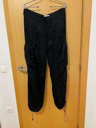Pantalón cargo de color negro con costuras blancas. - Diseño con múltiples bolsillos. - Cintura elástica. - Piernas anchas.
