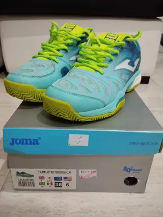 Zapatillas Joma T.Slam Lady 805 en color turquesa y lima. Perfectas para pádel o tenis. - Modelo: T.SLAM LADY 805 - Color: Turquesa Clay - Talla: 38 (UE) / 6 (UK) / 24.5 (CM) - Cierre con cordones - Suela de goma para mayor agarre