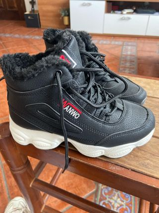 Botas de invierno, ideales para mantener los pies calientes. - Exterior de material sintético. - Forro interior de pelo sintético. - Suela de goma. - Cierre con cordones. Atenciòn son un 35 muy pequeño equivalente a 34 , largo de pie 21,5 cm. o algo menos.