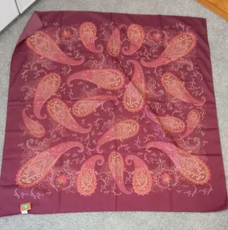 Pañuelo vintage nuevo en color vino con estampado de cachemira. Nuevo con etiqueta. Tejido suave y ligero Poliéster. Medida 88 cm.