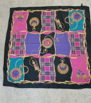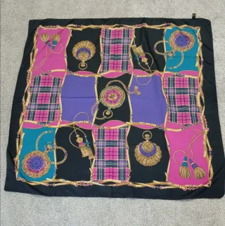Pañuelo vintage nuevo en color con estampado de perfumeros. Nuevo. Tejido suave y ligero Poliéster. Medida 88 cm.