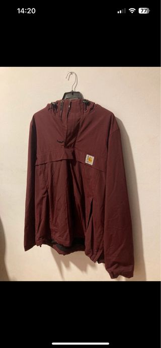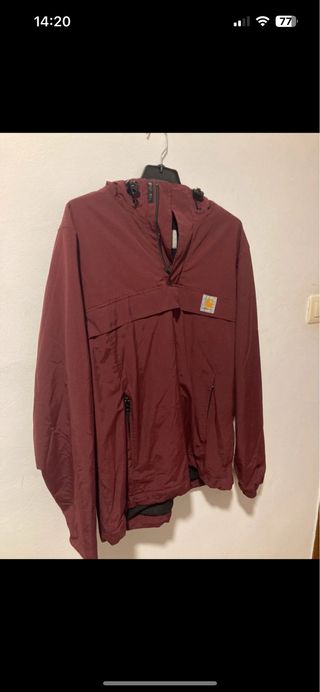 Chaqueta Carhartt de color burdeos. - Diseño con capucha. - Cremallera frontal parcial. - Bolsillo canguro. - Bolsillo lateral con cremallera.