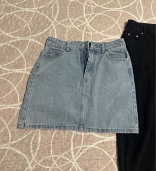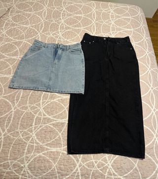 - Falda vaquera corta azul. - Falda vaquera larga negra con abertura lateral.