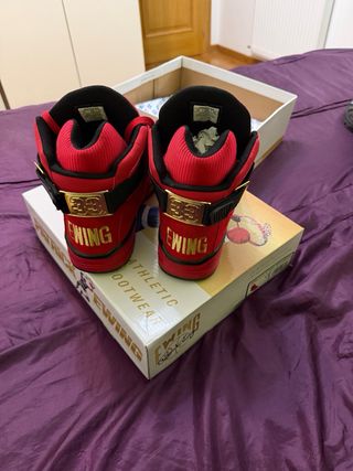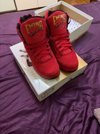Zapatos de baloncesto de la marca Ewing Athletics en color rojo. - Diseño de caña alta. - Detalles dorados. - Firma de Patrick Ewing en la lengüeta. -Sin usar, con otros cordones y conserva la caja