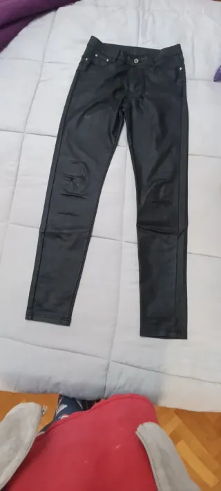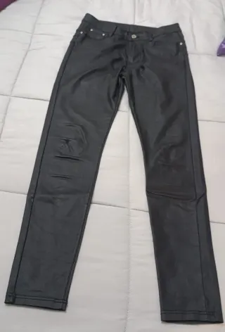 Pantalones de corte ajustado. - Material con acabado brillante. - Cierre de cremallera y botón. - Bolsillos delanteros y traseros.