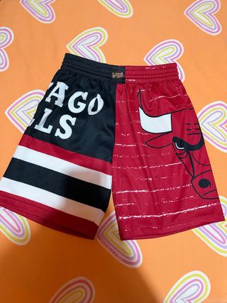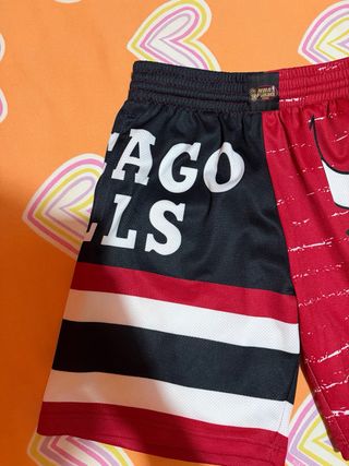 Pantalón corto deportivo con diseño dividido. - Mitad negra con CHICAGO BULLS en blanco. - Mitad roja con el logo del toro de los Bulls. - Rayas blancas y negras en el lateral izquierdo.