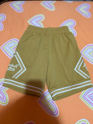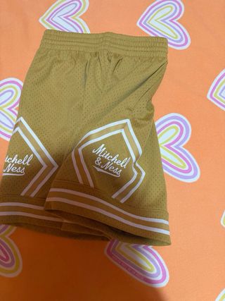 Pantalón corto de la marca Mitchell & Ness en color dorado. Diseño deportivo con detalles blancos. - Tejido de malla. - Cintura elástica. - Ribetes en los bajos.