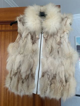Elegante chaleco confeccionado en piel y pelo, con un diseño que combina tonos beige y blanco. Ideal para añadir un toque de estilo a tu vestuario. - Material principal: Piel y pelo. - Cierre frontal con cremallera. Com marcas de uso por dentro , pero por fuera está impecable