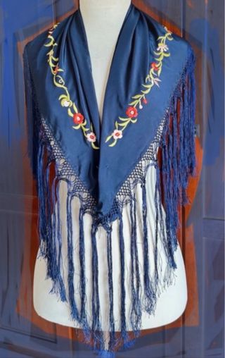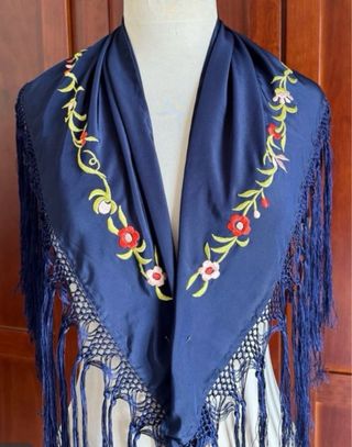 Mantoncillo de flamenca en color azul marino. Presenta un delicado bordado floral en tonos rojos, blancos y verdes. - Enflecado a mano. Medidas en la foto