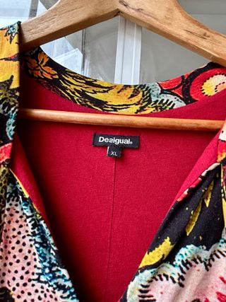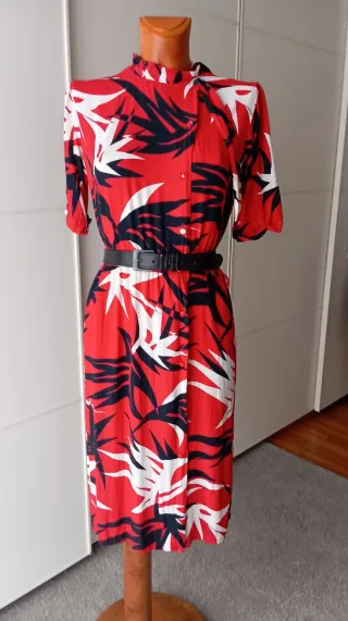 Vestido vintage color rojo, negro y blanco. Botones forrados que lo abren totalmente. Manga media. Detalle de lazada en el cuello lateral. Cuello medio. Goma en la cintura. Cinturón no incluido , sin cinturón. 100% Viscosa. Talla 38/40 aproximadamente. El maniquí es una talla 38. Si tienes dudas consulta las medidas. ✨💗 MEDIDAS 💗✨ Largo de talle, de hombro a cintura 42cm Largo 105cm Cintura con goma de 38cm a 47cm Cadera 47cm Sisa, ancho de axila a axila 51 cm Hombro a hombro 49cm