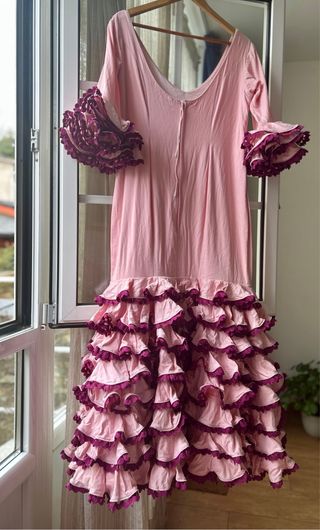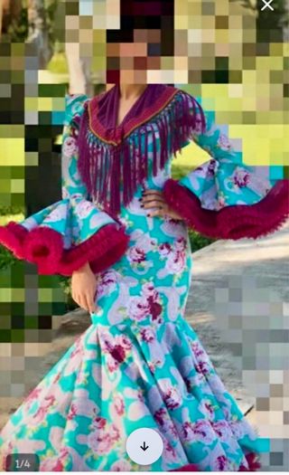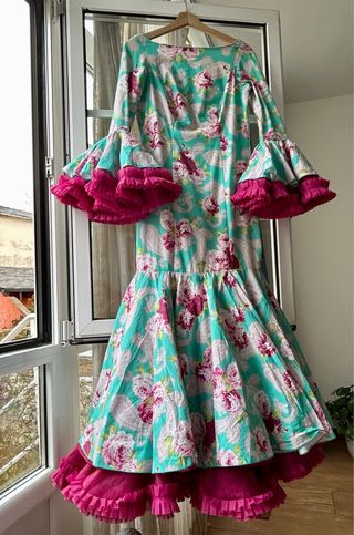 Vestido de flamenca , tiene unos colores preciosos y dispara mucho las mangas y el bajo de la falda lo que lo hace espectacular. - Estampado floral en tonos turquesa y buganvilla. -El cuello viene aparte ,se quita y se pone, como en la foto. Subiré más. es Precioso y me queda pequeño. Frente: 44 cm de axila a axila ( pero tiene costadillos y forma para el pecho) 39 cintura 47 cadera 137 largo