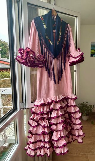 Hecho por modista, la tela es algo elástica y con firmeza. Color rosa y buganvilla. Tiene costadillos que estilizan y entallan la figura. Talla 46-48, pongo aquí las medidas del frente: entre axilas 50 cm. Cintura 45 cm cadera 55 cm. Largo 138 cm Bolsito a juego incluido Veo que tiene una línea un poco gastada en la espalda a la altura de la cintura. En mi opinión aun asi está en muy buen estado, hay que fijarse mucho.Pongo foto( y en esta foto el color sale distinto porque está sacada con luz artificial.) Le puse un mantoncillo marino ( no incluido) puede haber otros que le queden mejor, es el que tenía aquí a mano.
