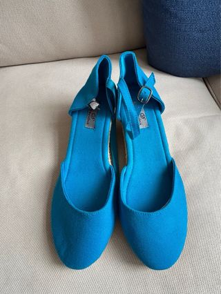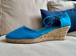 Alpargatas de cuña con un vibrante tono azul cyan. Perfectas para añadir un toque de color a cualquier atuendo. - Diseño de cuña. - Correa de tobillo ajustable. - Material textil.