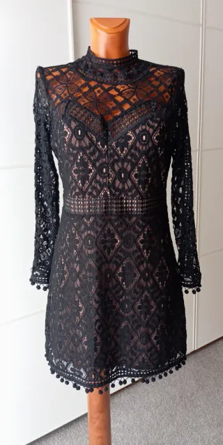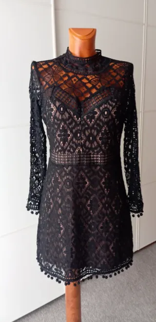 Vestido de encaje negro. Con forro interior color beige tostado. Manga larga. Detalle de pompones en puños y bajo del vestido. Se abre con cremallera trasera. Segunda mano en buen estado. No es una prenda nueva. Poliéster y poliamida. Talla L de etiqueta. Talla 40 aproximadamente. El maniquí es una talla 38. Si tienes dudas consulta las ✨💗 MEDIDAS 💗 ✨ largo de talle, de hombro a cintura 36,5cm Largo total 83cm Sisa, ancho de axila a 48cm Hombro a hombro 40cm Cintura39cm Cadera 46cm