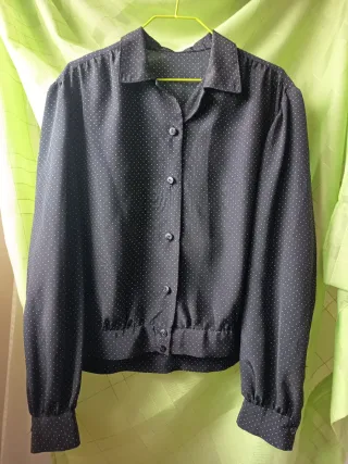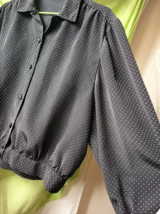 Camisa, blusa negra vintage con lunares blancos. Cuello bebe. Pinzas en el pecho. Tejido fresco y ligero un poco traslúcido Manga larga con puño en goma. Es de confección no tiene etiquetas. Talla 40 aproximadamente. El maniquí es una talla 38 y yo creo que sirve hasta una 42. Si tienes dudas consulta las medidas. ✨💗 MEDIDAS 💗✨ Largo 61 ck Sisa, ancho de axila a axila 55cm Hombro a hombro 38cm