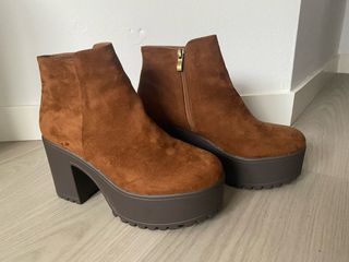 Botines de tacón con plataforma en color marrón. - Material tipo ante. - Cierre de cremallera lateral. - Suela gruesa con plataforma. - Tacón ancho y alto.