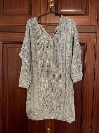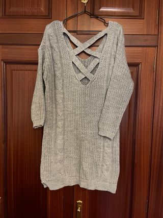 Original jersey largo, de punto, en color gris y escote en pico. Tiene un adorno con tiras en la espalda. Talla única.