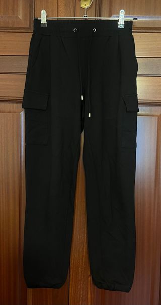 Pantalones jogger negros en talla S. Se encuentran en muy buen estado. - Diseño con bolsillos cargo. - Cintura elástica con cordón ajustable. - Puños elásticos en los tobillos.