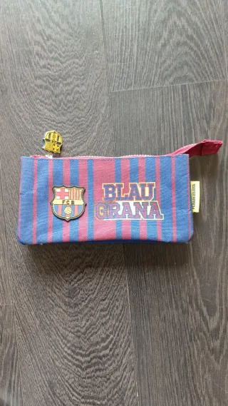 Estuche con diseño de rayas azules y granates, inspirado en el FC Barcelona. - Incluye un pin con el escudo del club. - Detalle de Blau Grana en la parte frontal. - Etiqueta lateral con FCBARCELONA.