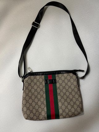 Bandolera de la marca Gucci con un diseño moderno y versátil. - Correa ajustable con detalles en rojo y azul. - Compartimento principal con cierre. - Logo de la marca visible en la parte frontal.