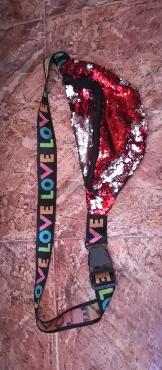 Riñonera con un diseño llamativo de lentejuelas reversibles. - Lentejuelas brillantes en tonos rojos y plateados. - Correa ajustable con estampado LOVE multicolor. - Cierre de cremallera.