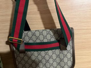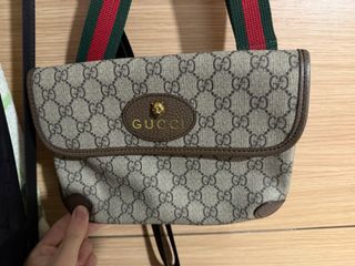 Riñonera con el clásico estampado GG de Gucci. - Diseño con solapa. - Detalle de ovalo con logo y cabeza de tigre. - Correa ajustable con detalles de rayas verdes y rojas.