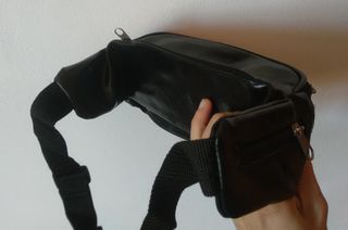 Riñonera amplia negra con tachuelas plateadas y negras. Gran compartimento principal, dos pequeños a los costados y uno posterior. Jamás usada