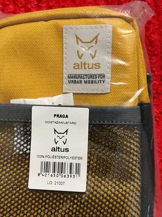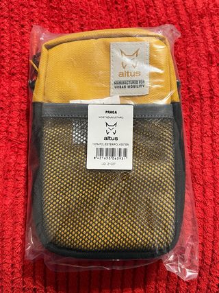 Riñonera Altus modelo Praga en color mostaza con detalles en gris y negro. Perfecta para llevar tus esenciales: documentos de viaje, cartera, móvil, gafas de sol, ... Cuenta con correa ajustable, bolsillo central con cierre de cremallera y otro departamento delantero de red. Como se puede ver, nunca ha sido utilizada y conserva su embalaje original. Medidas en las fotos. Poliéster 100% - Unisex