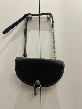 Riñonera de piel con un diseño moderno y versátil. - Material: Piel. - Color: Negro. - Correa ajustable. - Cadena metálica. - Cierre de botón a presión.