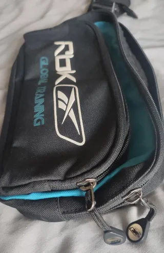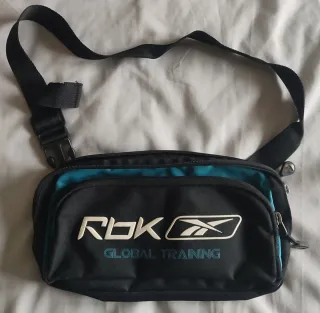Riñonera de la marca Reebok con un diseño moderno y práctico. - Color principal negro con detalles en turquesa. - Logo de Reebok en blanco. - Inscripción GLOBAL TRAINING en la parte frontal.