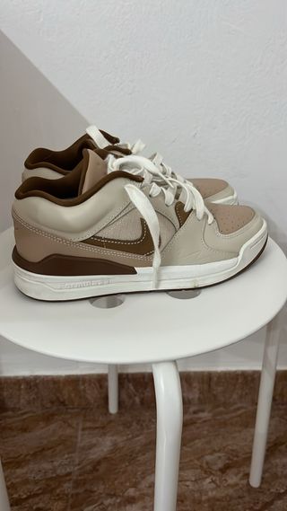 Zapatillas de la marca Jordan en tonos beige y marrón. Un diseño moderno y versátil. - Combinación de colores beige y marrón. - Detalle de logo en el lateral. Poco uso